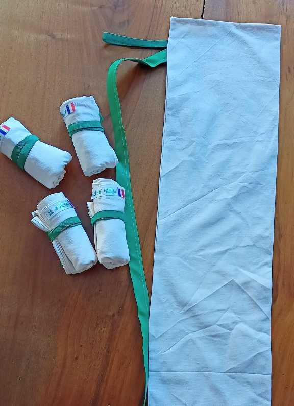 Glisser le pain dans le sac (le sac à pain peut contenir un pain ou bien 2 ou 3 baguettes) refermer avec l’élastique et le mettre sur l’épaule !